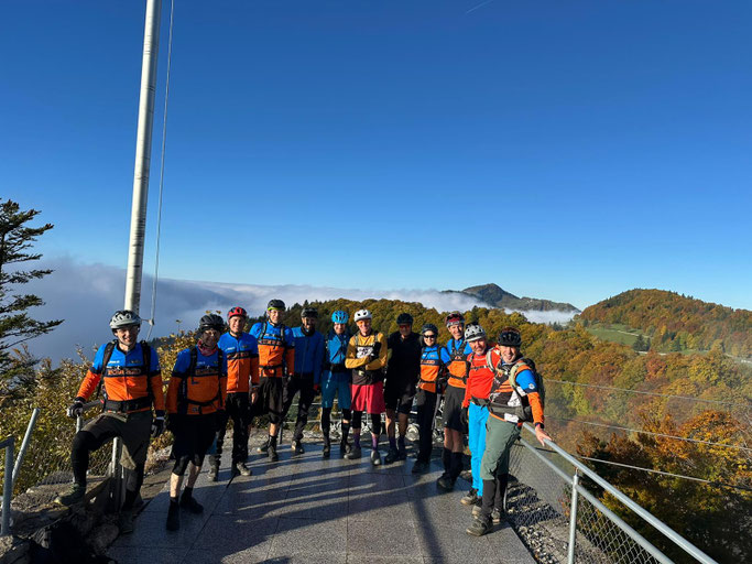 Startpunkt war das Sportzentrum in Zuchwil. Von dort ging’s nach Oberdorf und mit der Weissensteinbahn durch den Nebel hinauf, bis wir unter stahlblauem Himmel standen. Weiter ging es mit den Bikes, erster Halt im Althüsi. Danach führte uns der Weg hinauf zur Hasenmatt. Schoner anziehen war angesagt, denn der erste Trail hatte es in sich.